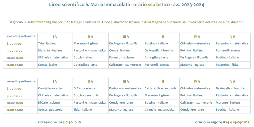 - consultare e scaricare l'Orario completo per la Scuola Secondaria di Primo Grado (Orario completo Sc. sec. 1°) e per il Liceo (Orario completo Liceo)